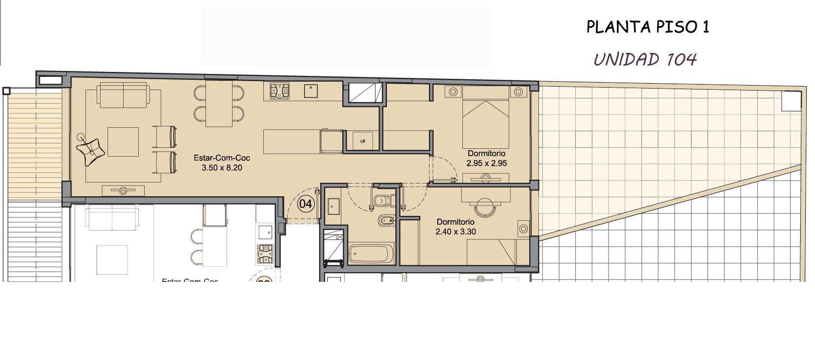 Cómodo living-comedor con cocina integrada, doble mesada con placares abajo y aéreo. Conexiones para calefón y lavarropas dentro de placar. Linda terraza al frente.